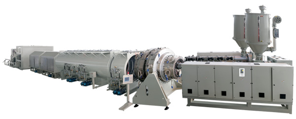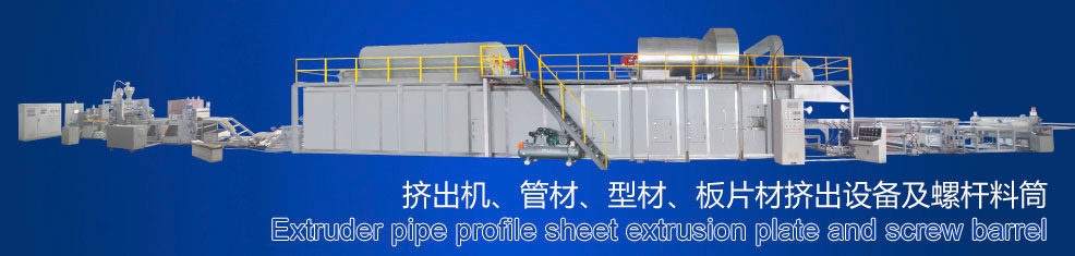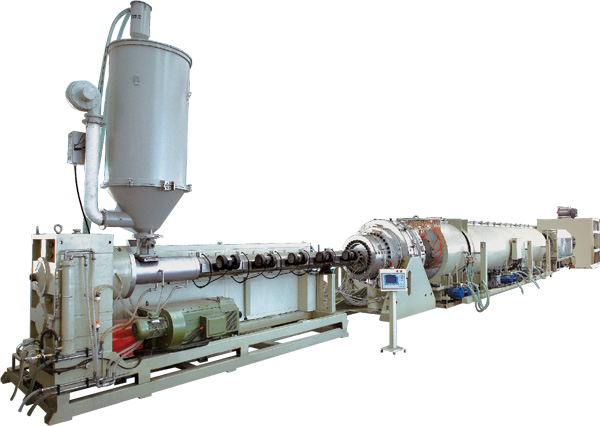 Characteristics of the equipment: PE series plastic pipe extrusion line is mainly used in the area of agricultural water supply system, architectural water supply system, pavement of cables¡etc. This machine group consists mainly of vacuum calibration tank, haul-off unit, cutting unit, tilter¡etc. Single screw extruder and haul-off unit have applied imported A/C inverter; both vacuum pump and driving motor have applied excellent products. The haul-off unit includes two-claw type, three-claw type, four-claw type, six-claw type, eight-claw type, ten-claw type, twelve-claw type¡etc. No-scraps cutting, saw cutting or planetary cutting can be applied, the property of machine group is reliable, the production efficiency is high. With special device, it can produce inner wall spiral pipe, inner wall hollow pipe, and core layer foam pipe¡etc. it can also produce PP,PE,ABS,PPR,PEX, silicon core pipe and pipe of other material. The planetary cutting machine is fully automatic computer digital control; it has such advantages of simple operation, reliable property, etc. It has reached world advanced level.